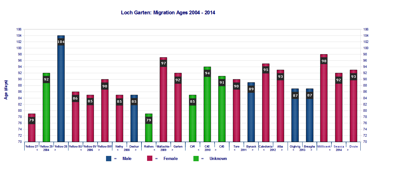 Main Index Loch Garten Charts LG Fledging Ages Chart LG Fledge/Migration Comparison Chart   Days from Fledge to Migration Chart